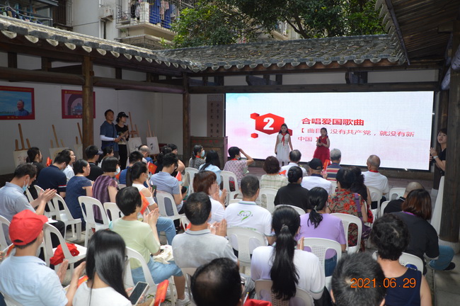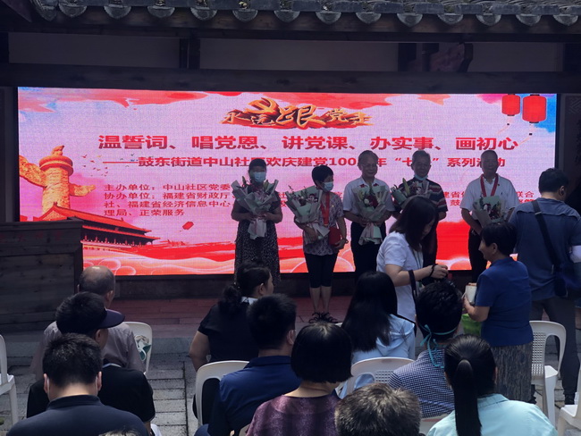 活动开始,集体向社区“光荣在党50年”的老党员献鲜花,并向他们致以热烈的祝贺和崇高的敬意;接着在社区书记领誓下,面对鲜红的党旗举起右拳,庄严地重温了入党誓词;随后全体党员慷慨激昂地合唱了歌曲《没有共产党就没有新中国》;福建省社会主义学院统战理论教研部丘赠英还为大家主讲了《百年党史之红色福建》的专题讲座,最后开展了党史知识竞赛问答活动。