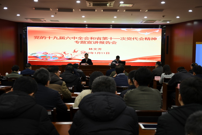 1月11日上午,省经济信息中心举办党的十九届六中全会和省第十一次党代会精神专题宣讲报告会。省委党史学习教育第11巡回指导组副组长林文芳作宣讲报告,中心党委书记、主任蔡荣富主持会议,中心领导班子成员和全体党员、干部参加报告会。