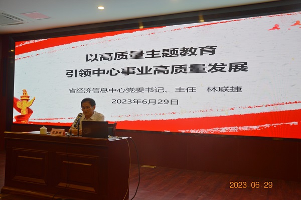 6月29日,在中国共产党成立102周年来临之际,为扎实开展学习贯彻习近平新时代中国特色社会主义思想主题教育,省经济信息中心党委书记、主任林联捷以《以高质量主题教育推动中心事业高质量发展》为题,为全体党员干部讲授主题教育专题党课。