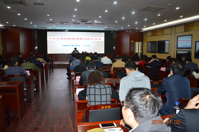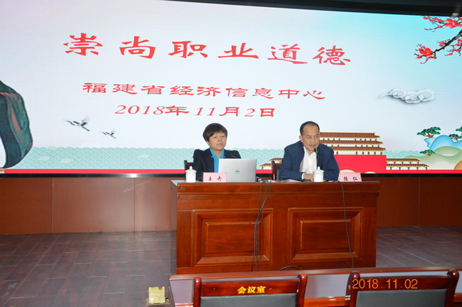 为进一步培育和践行社会主义核心价值观,不断提升中心干部职工思想道德素质,形成良好文明道德风尚,深入推进省级文明单位创建活动,2018年11月2日省经济信息中心组织开展“崇尚职业道德讲堂”活动。活动由中心党委副书记、副主任陈仁主持,并邀请福州市委党校、福州市行政学院行政管理教研部王卉主任作题为《公务人员职业道德与综合素质》的讲座。