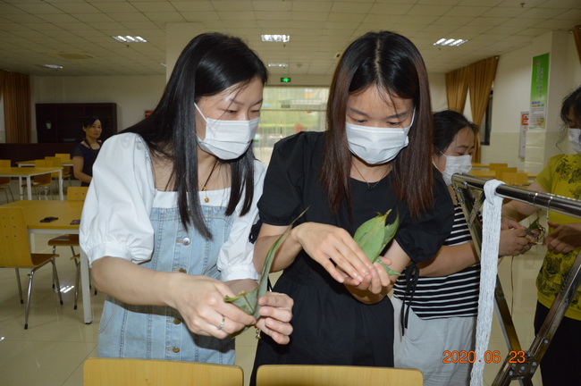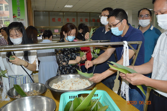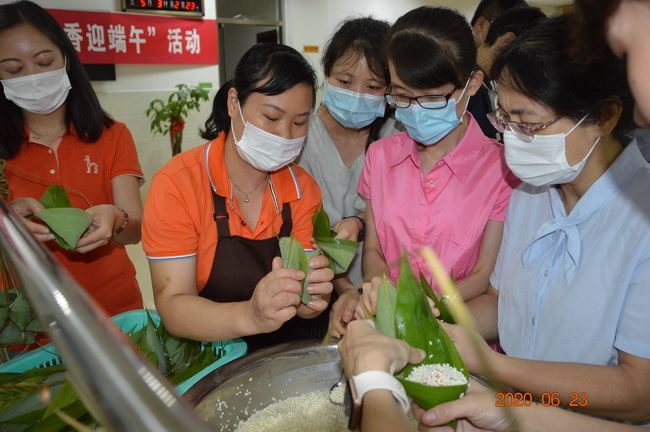 活动前,食堂工作人员把清洗好的糯米、粽叶、蜜枣、腊肉等包粽子的材料整齐地摆放在桌子上,为包粽子做好准备工作。活动开始,大家都纷纷露出看家本领,捋粽叶、填糯米、封口、扎捆,巧手翻飞,不一会儿功夫,一只只漂亮粽子瞬间成型。活动中,大家还开心地交流经验,聊端午习俗,共同感悟中华民族博大精深的文化,传递节日的温暖。尽管大家的包粽子技术参差不齐,但现场频频传来大家的欢声笑语。