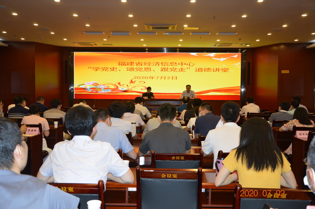为庆祝建党99周年,传承红色基因,弘扬革命精神,不忘初心、牢记使命,以党建为引领,大力促进中心精神文明建设,2020年7月2日下午,省经济信息中心开展“学党史、颂党恩、跟党走”道德讲堂活动。活动邀请省委党校副教授、博士高莹同志作辅导报告,中心俞希标副主任主持活动,全体干部职工参加活动。