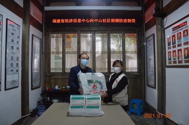 春节将至,人员流动及聚集日益频繁,疫情传播风险剧增,为了严格落实“外防输入、内防反弹”的防控策略,协助对口社区落实常态化疫情防控任务,2021年1月22日上午,杨东副主任代表省经济信息中心向中山社区捐赠了1000个疫情防控口罩,杨东副主任表示,社区是疫情防控的关键,看到社区工作人员在一线奔波忙碌,努力守护广大居民群众的平安,我们应当为奋战在防疫一线的社区工作人员提供一份安全和保护,为社区防疫工作尽微薄之力。