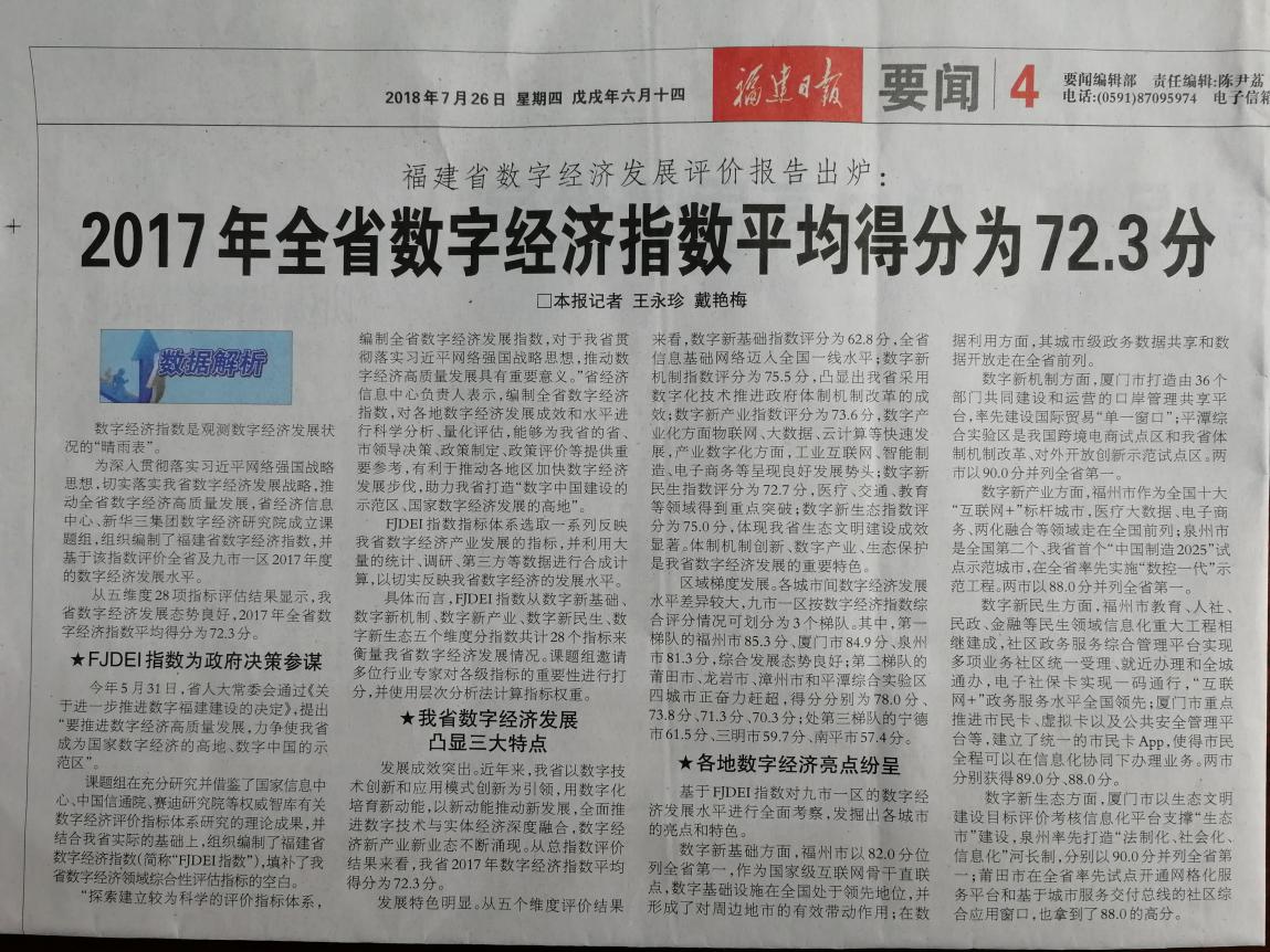 为深入贯彻落实习近平网络强国战略思想,切实落实我省数字经济发展战略,推动全省数字经济高质量发展,中心积极组织编制福建省数字经济指数(简称FJDEI指数)。一是组建研究团队,加强与新华三集团数字经济研究院合作,成立课题组,共同开展指数研究。二是构建指标体系,课题组梳理并借鉴了国家信息中心、中国信通院、赛迪研究院等权威智库的指数研究成果,结合省情实际,构建我省数字经济指数指标体系,同时邀请省内外专家就指标体系的科学性与合理性进行了研究探讨,形成了《福建省数字经济指数指标体系研究》成果。三是编写评价报告,基于FJDEI指数评价全省及九市一区2017年度的数字经济发展水平,形成了《2017年福建省数字经济发展评价报告》成果。近日,福建日报通过纸媒、官方微信、新福建等权威平台发布了指数研究的主要成果。福建日报指出,该指数填补了我省数字经济领域综合性评估指标的空白。下一步,课题组将充分吸纳各方反馈意见和建议,继续加强同省内外权威智库的合作,进一步完善评价指标体系,强化数据采集,更加全面、准确、科学地反映全省及九市一区的数字经济发展情况,助力我省建设成为国家数字经济发展的高地。