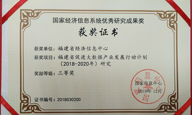 国家信息中心近日发布了《关于国家经济信息系统优秀研究成果奖2018年度获奖项目的通知》(国信学术〔2019〕1号),省经济信息中心申报项目《福建省促进大数据产业发展行动计划(2018-2020年)研究》荣获三等奖。本次优秀研究成果奖一共评选出1项一等奖、5项二等奖和7项三等奖。